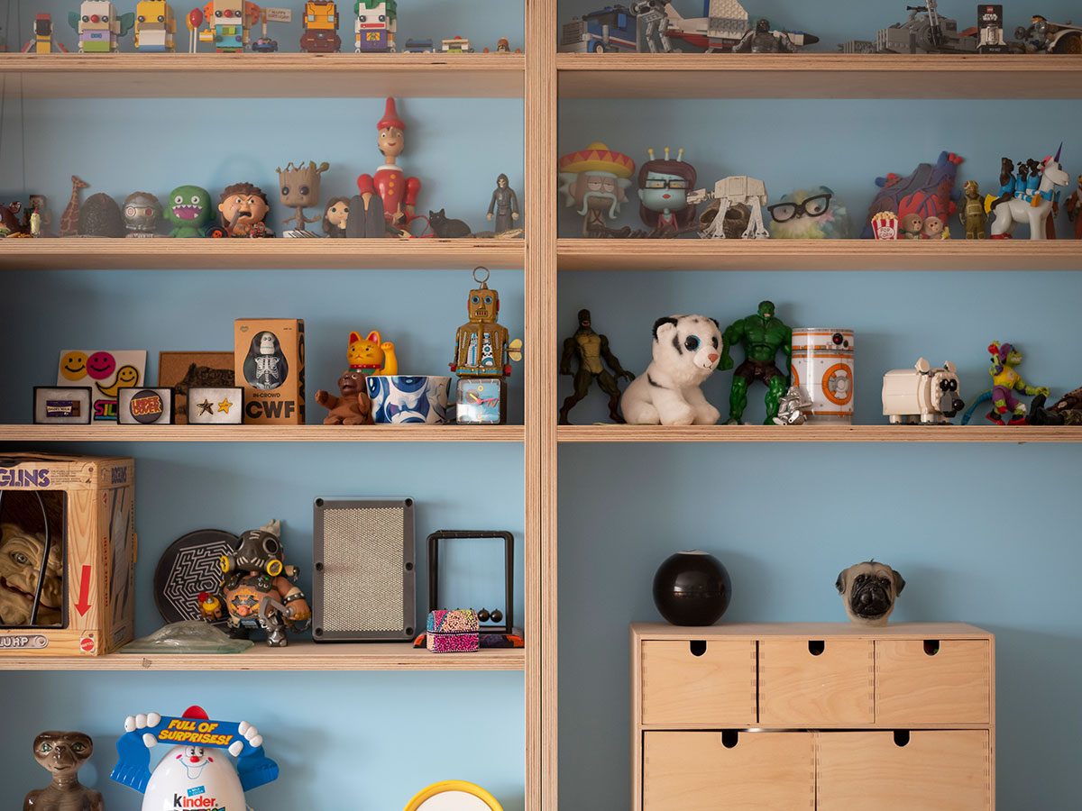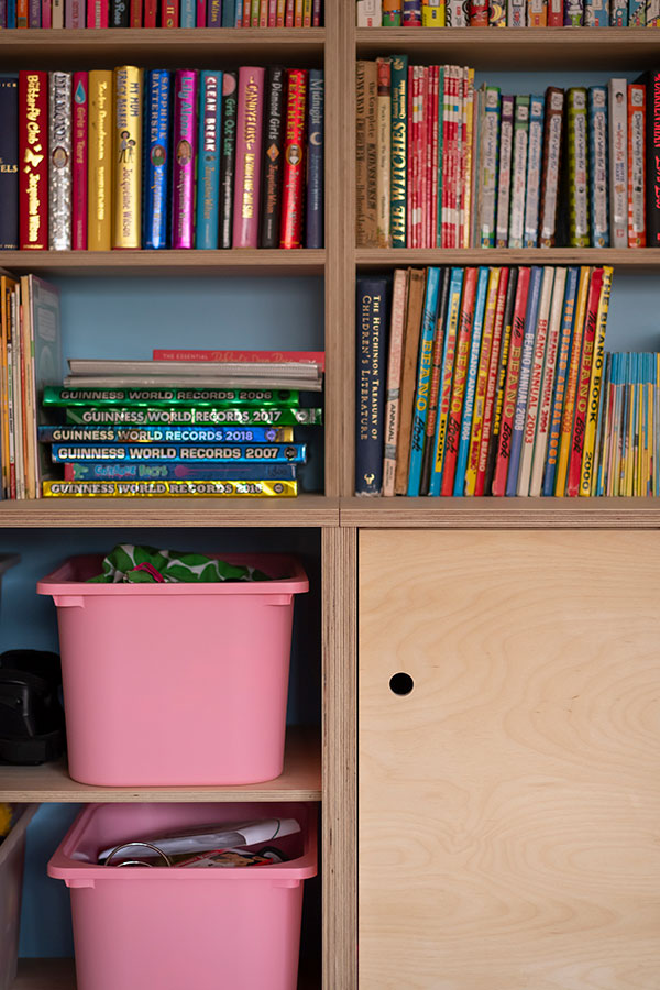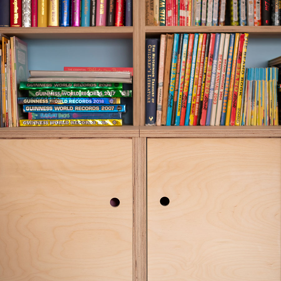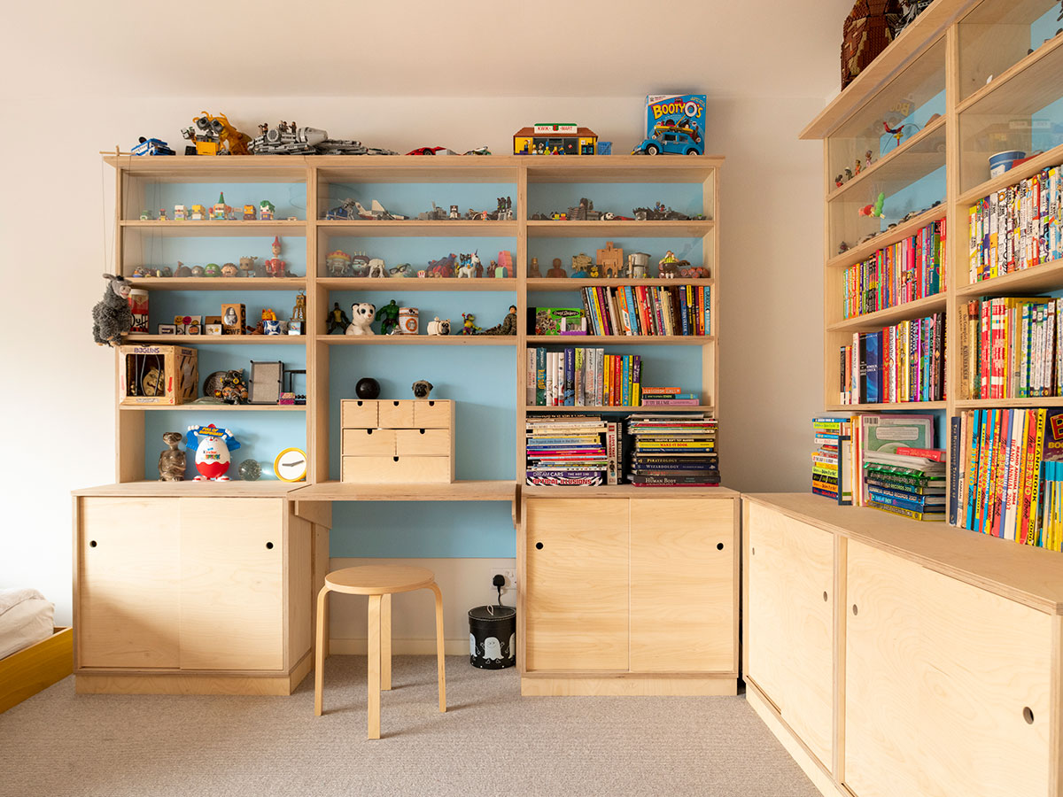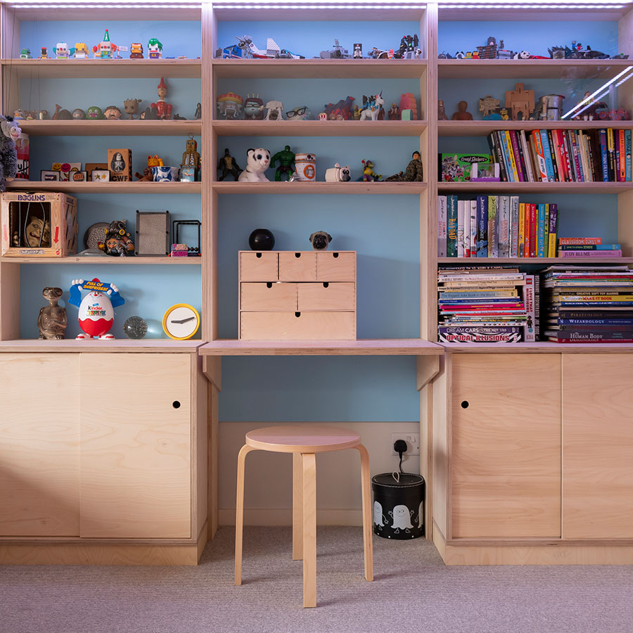 Plywood shelving for East Sussex apartment, with LED lighting, glazed sections and desk.