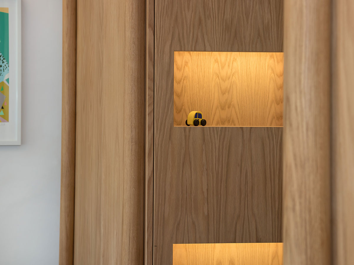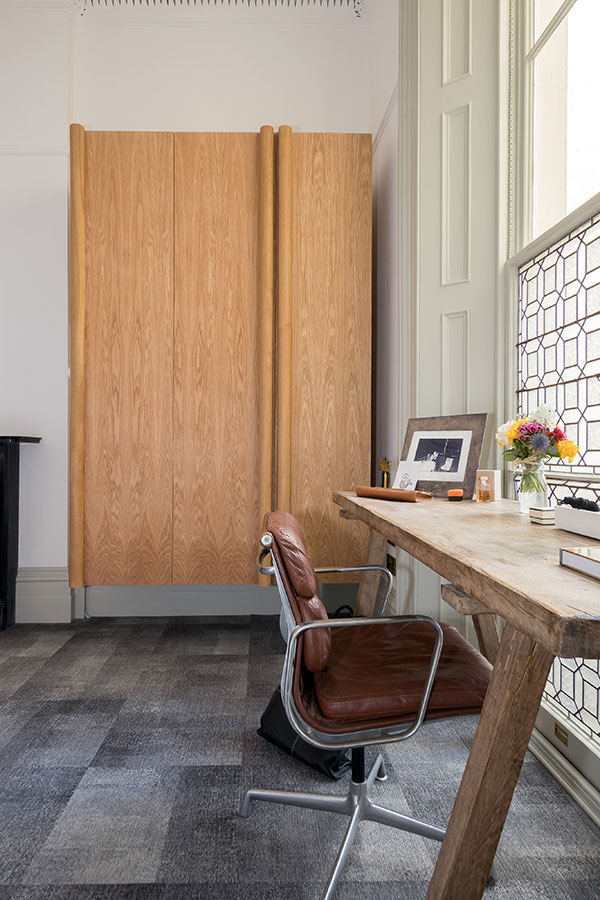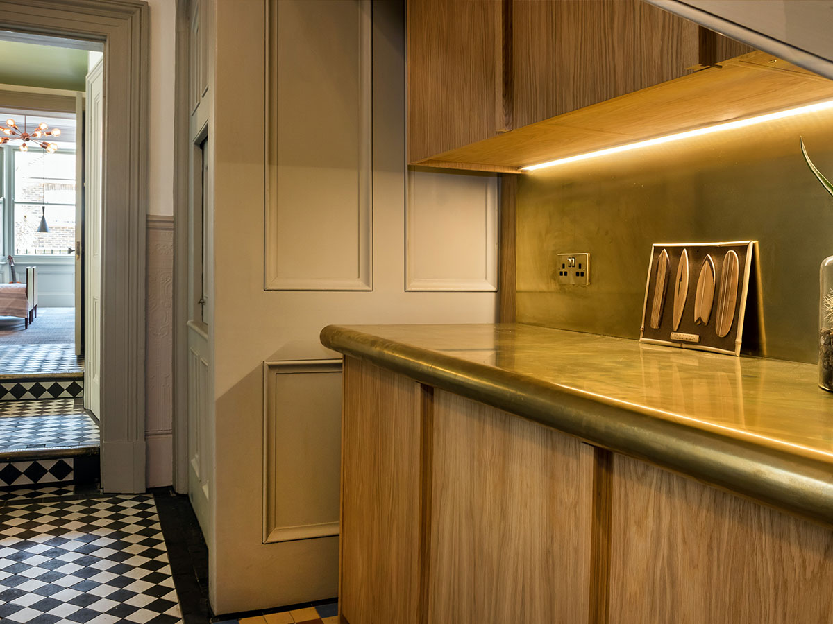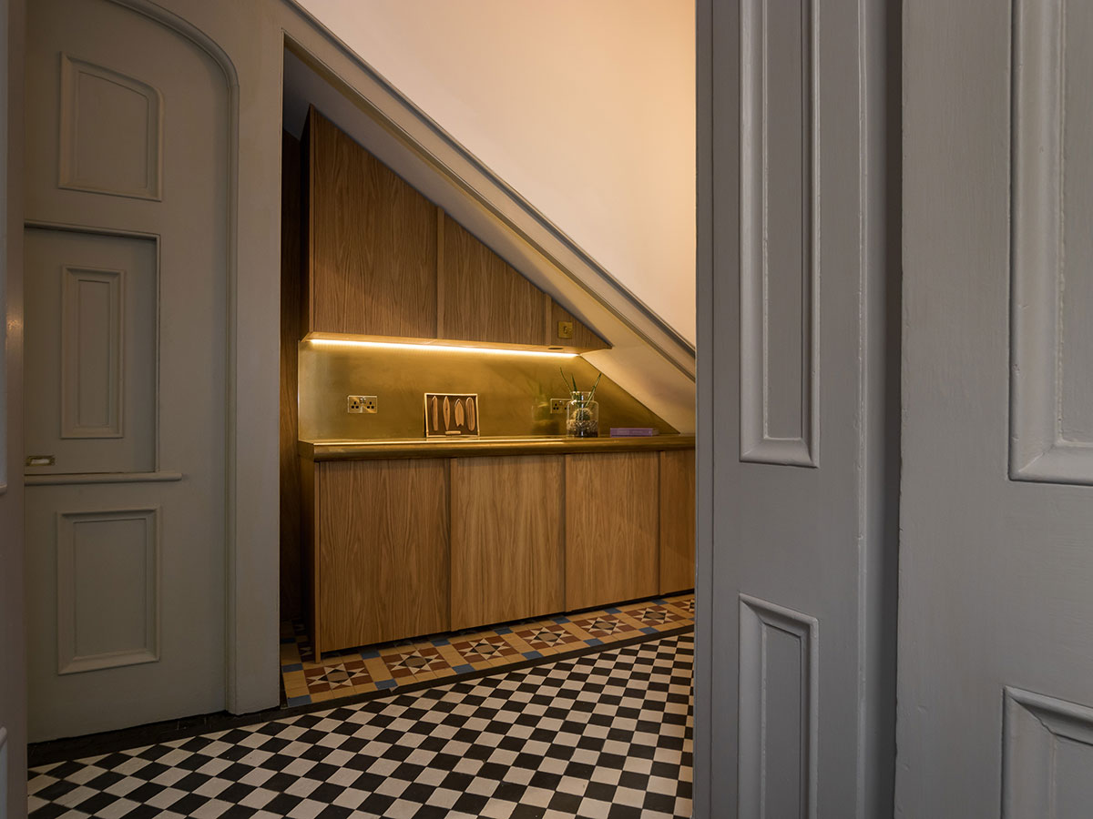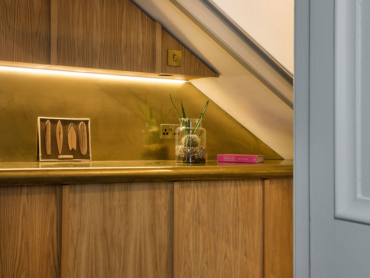 Floating oak and brass storage and cabinets for a period residence..
