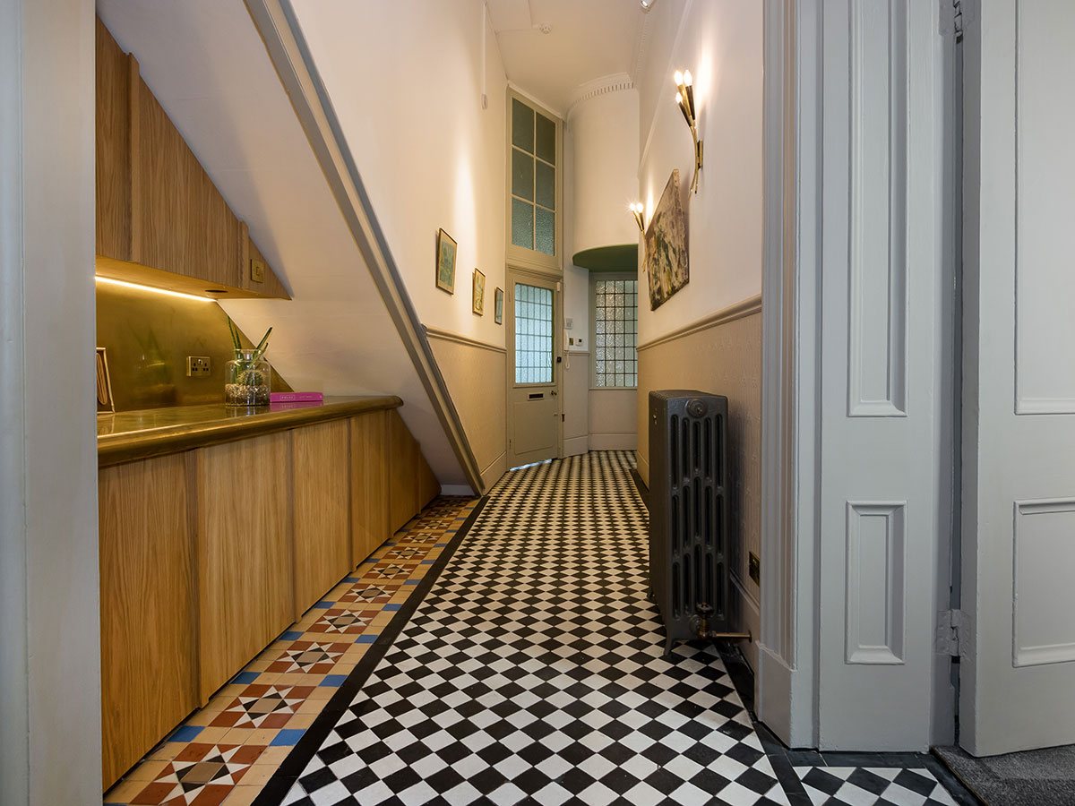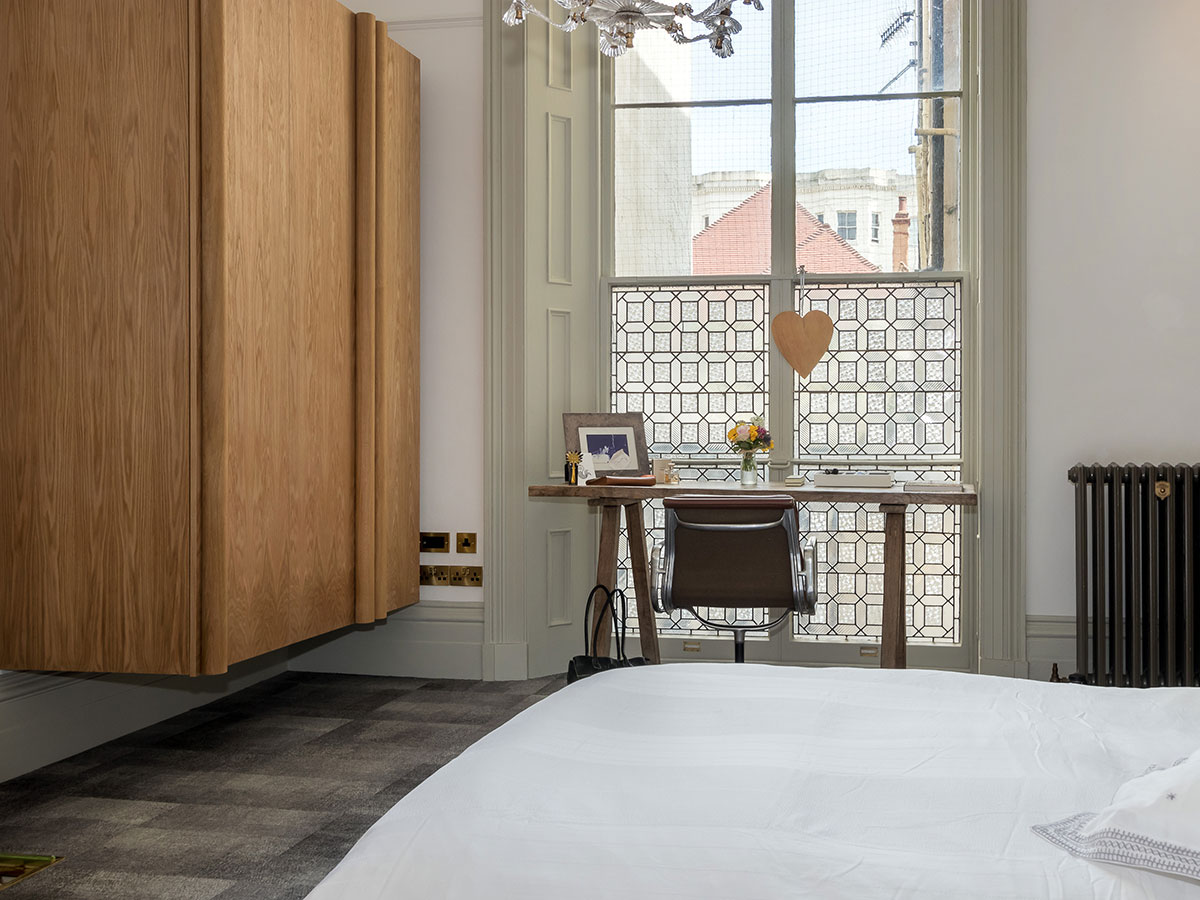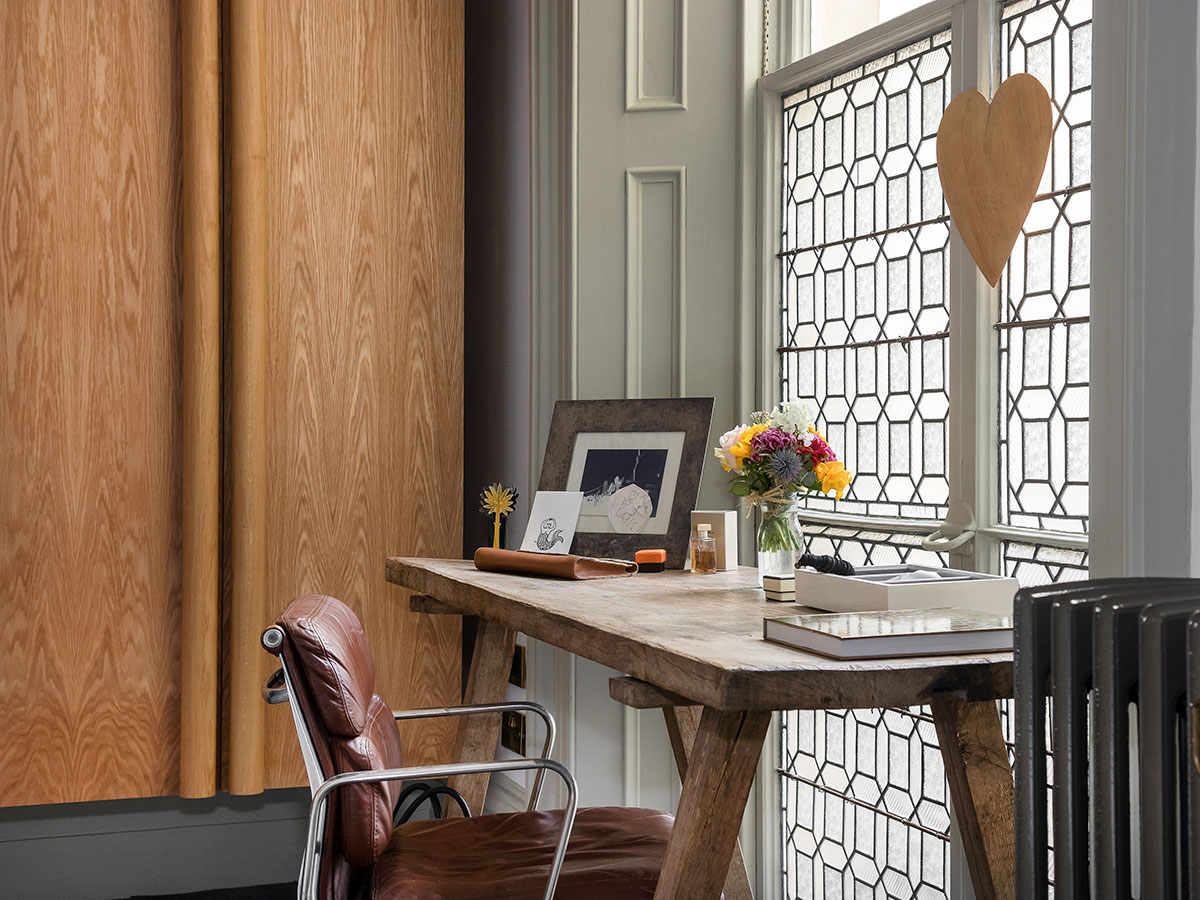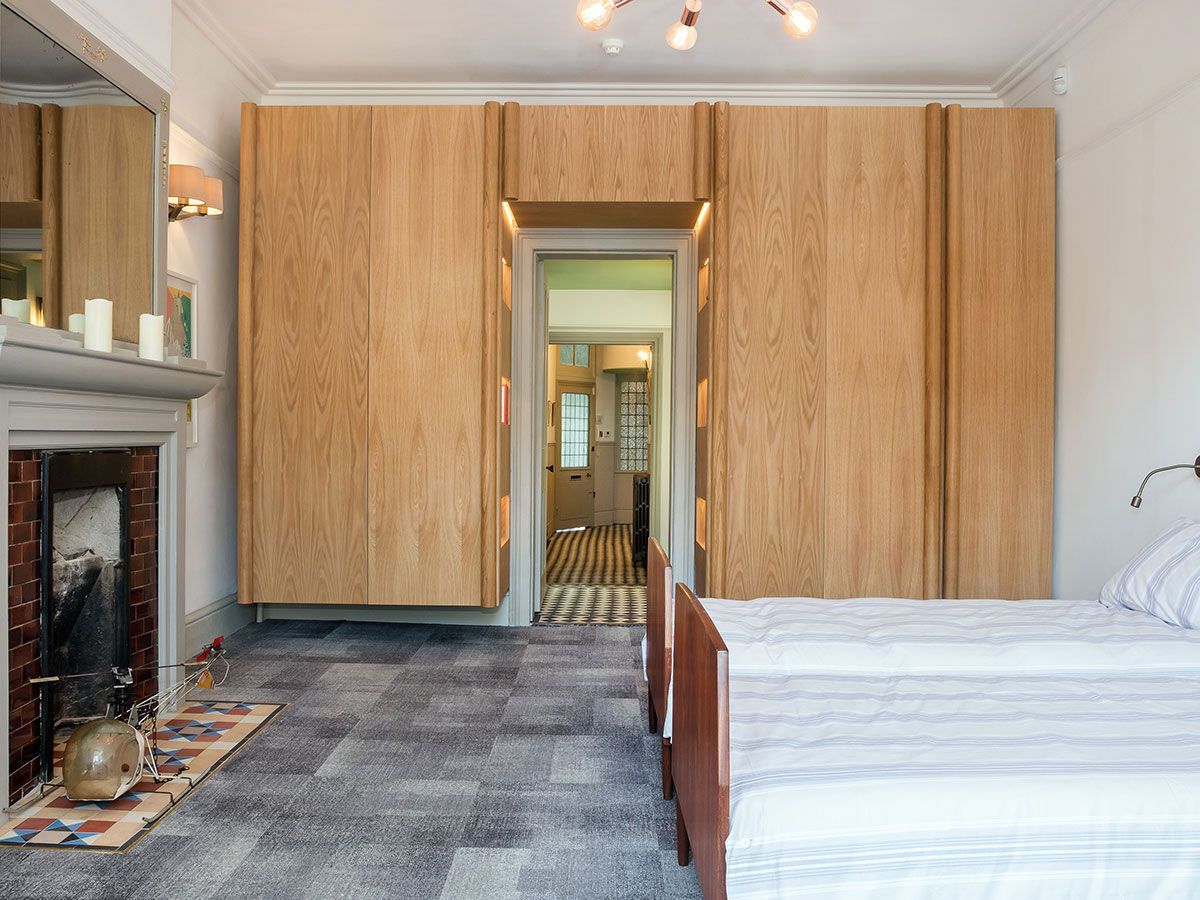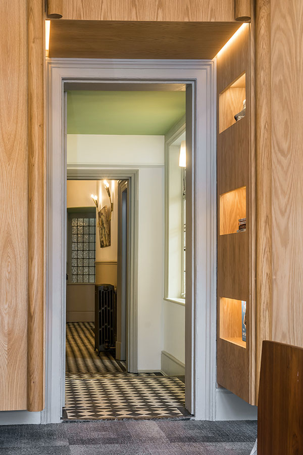 Floating oak and brass storage and cabinets for a period residence..