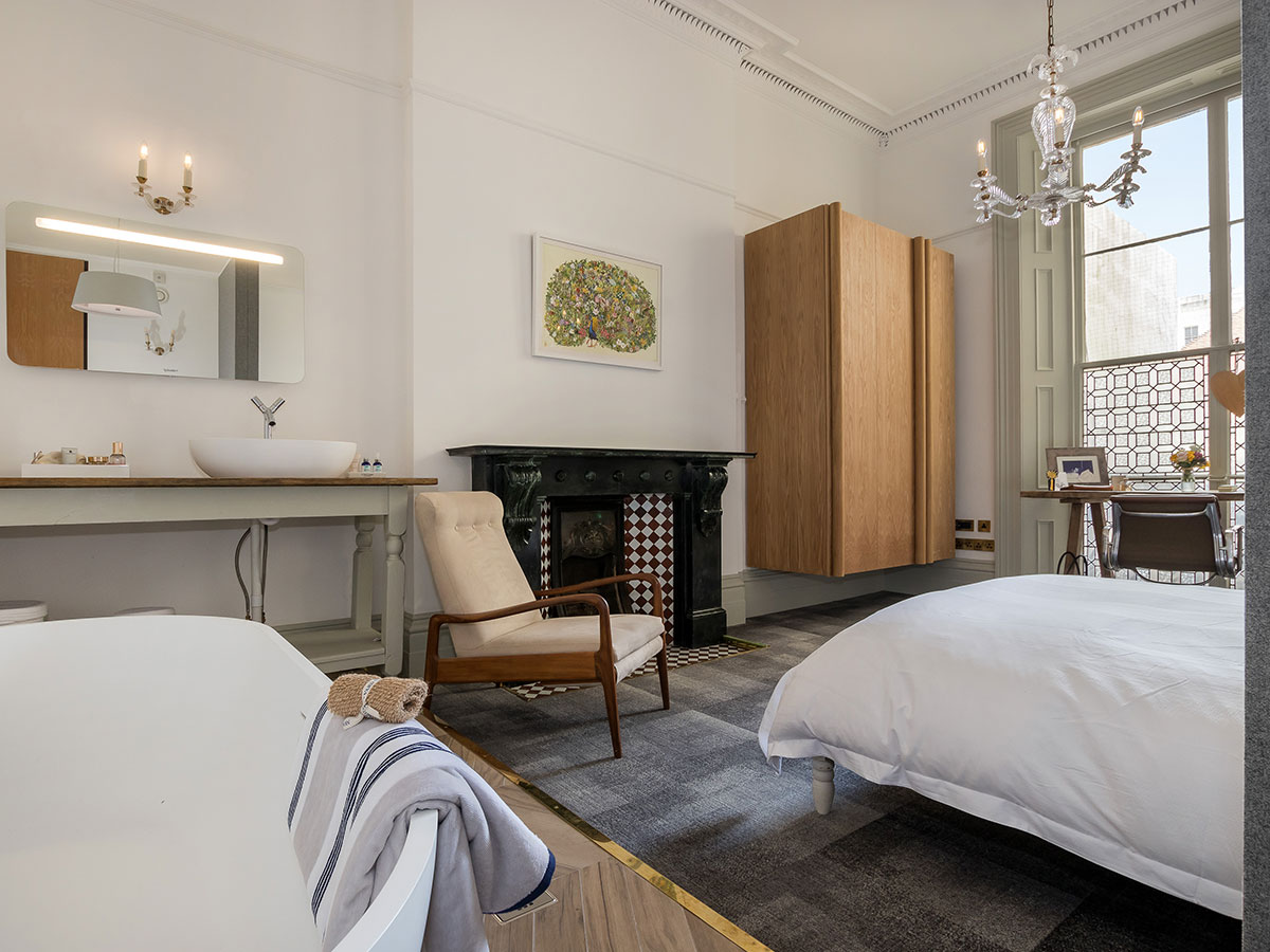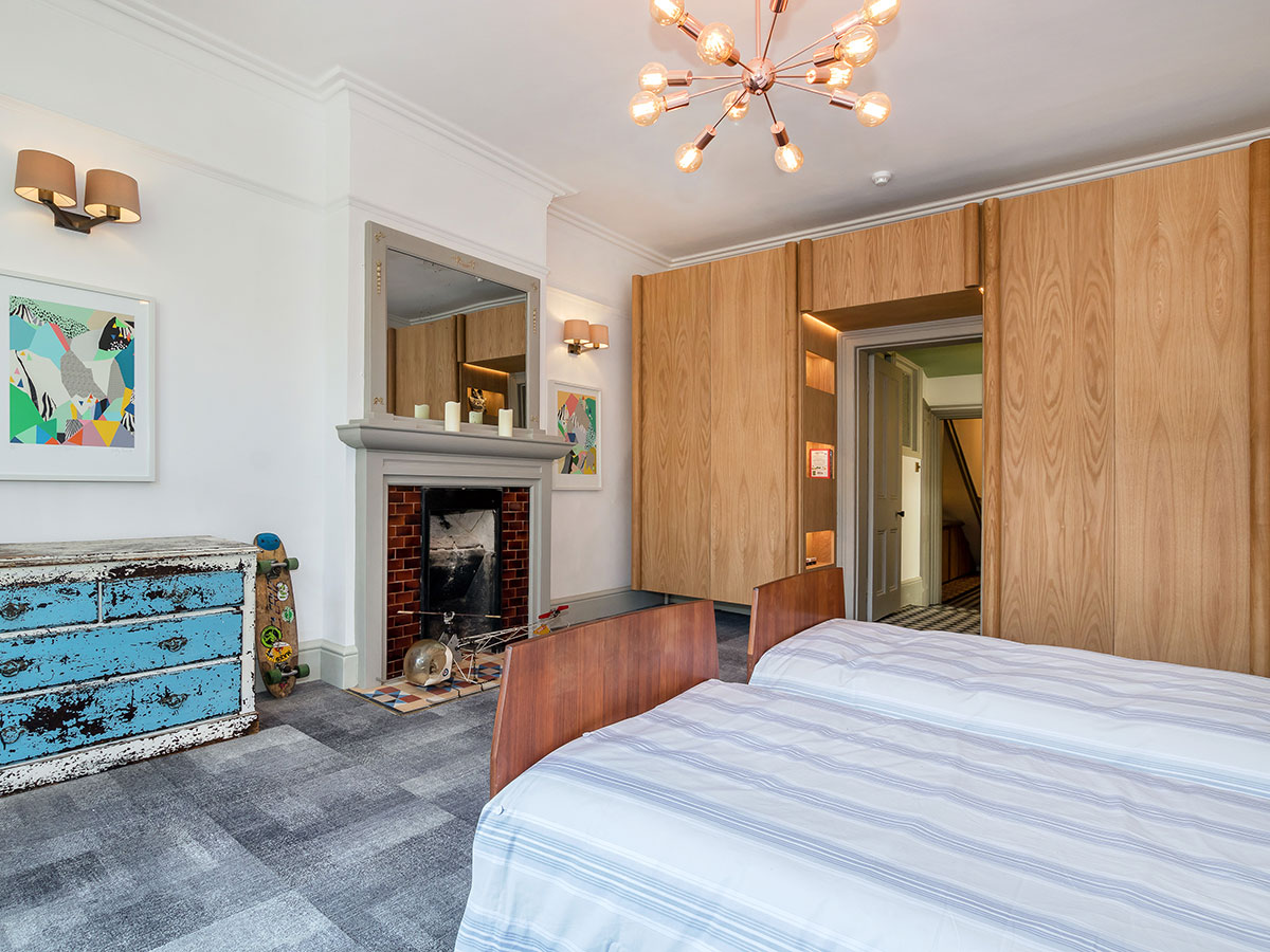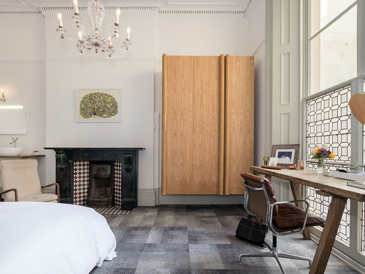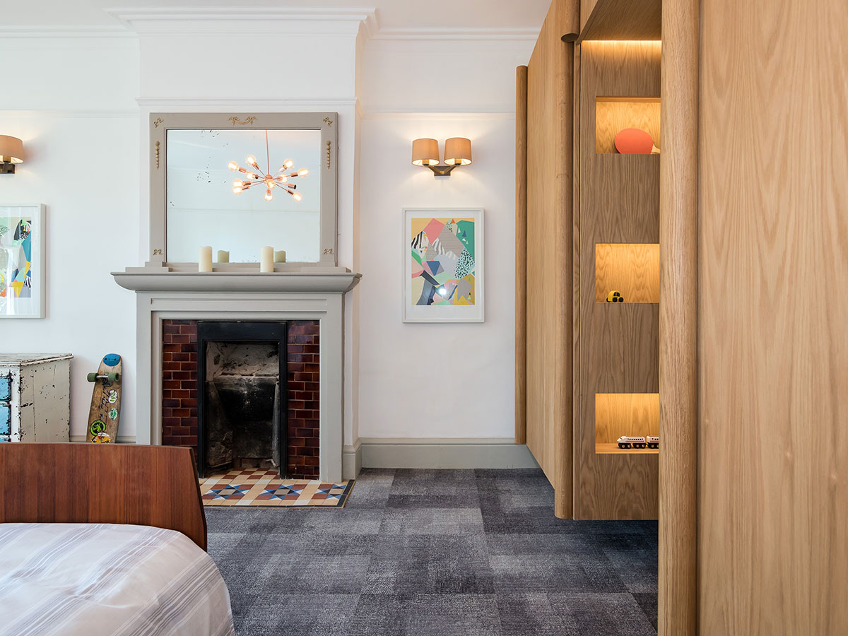 Floating oak and brass storage and cabinets for a period residence..